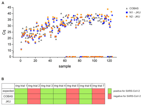 | Cq (COBAS) | Cq (N1) | Cq (N2) | Cq (COBAS) | Cq (N1) | Cq (N2) | ||