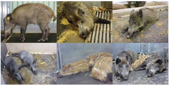 Clinical signs in wild boar of different age classes. Top row from left to right: hunched-up back and depression (left) in a sub-adult boar, severe depression and inappetence in a boar (center), severe but unspecific signs, respiratory problems in a sub-adult animal (right). Bottom from left to right: severe depression and moribund state in (sub-)adult females (left), piglets with high fever and reduced liveliness that later on recovered (center), and the same piglets and two adult females showing severe, unspecific signs (right).