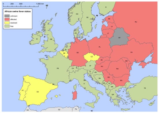Table 1 gives an overview of the introduction of ASF into different European countries in wild boar, and Figure 2 shows the current (as of 8 July 2021) status of ASF in the different European countries in wild boar.