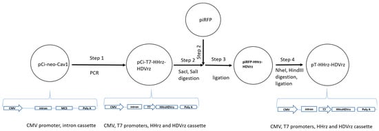 The vector backbone pT-HHrz-HDVrz was generated by molecular cloning methods through several steps as schematically described in Figure 1. The aim was to create a cassette of two promoters and the ribozymes at both ends of the inserted MV antigenome. For this purpose, the plasmid pCi-neo-CAV1 contains a cassette of CMV promoter and the intron and was used as the template for the PCR with the designed primers containing the ribozymes and MV’s leader and trailer sequences. The resulting plasmid (Figure 1, step 1) was named pCi-T7-HHrz-HDVrz and was then used to be subcloned into a low copy plasmid piRFP by digestions of both plasmids with restriction enzymes SalI and SacI (Figure 1, step 2). The resulting plasmid clone (Figure 1, step 3) was named piRFP-HHrz-HDVrz and confirmed by sequencing. In the plasmid piRFP-HHrz-HDVrz, there is a partial fragment of the iRFP gene left (Figure S1D). The plasmid piRFP-HHrz-HDVrz was digested with restriction enzymes NheI and HindIII to remove the remaining iRFP fragment (408 bp). The resulting remaining vector backbone was ligated into a new plasmid pT-HHrz-HDVrz (Figure 1, step 4) and confirmed by sequencing. This pT-HHrz-HDVrz plasmid contains a cassette of two promoters CMV and T7, where three G residues were placed directly downstream of the T7 promoter sequences. The HHrz sequences were designed according to the leader sequences of MV, where the hairpin structures promote correct folding and exact cleavage at the 5′ end of the MV sequences. At the 3′ end of the cassette, the HDVrz provides exact cleavage at the 3′ end of the RNA [17]. The HDVrz was placed between the MV trailer sequences and the SV40-polyA-terminator (Figure S1E).