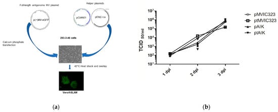 Rescuing the MV from cDNA and growth curve kinetic: (a) Schemata of the reverse genetics protocol as described in the method; (b) multiple-step growth kinetics of four recombinant MVs in Vero/hSLAM. pT_IC323 (rescued from plasmids pT(+)MVIC323-eGFP), pT_AIK (rescued from pT(+)MVAIK-eGFP), IC323 (rescued from p(+)MV323-eGFP), and AIK (rescued from p(+)MVAIK-eGFP) were analyzed on Vero/hSLAM at different time points.