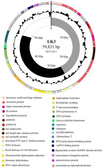Genomic map of circularly permuted vB_BbrS_LK3 Bordetella phage dsDNA: the outer ring illustrates the encoded genes/ORFs with putative functions indicated in the legend below the circle; the central ring represents GC% content in the genome; the inner ring represents modules: (i) nucleotide metabolism and DNA replication (black); (ii) host interaction module (white), and (iii) particle structure and packaging module with lysis cassette (grey).