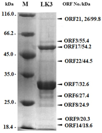 Structural proteins of LK3 phage were analyzed by 1D sodium dodecyl sulfate-polyacrylamide gel electrophoresis (SDS-PAGE) and at least 9 protein bands of ~18–100 kDa were detected, including major capsid proteins with a molecular weight of ~32.5 and 54.2 kDa (Figure 2). All bands corresponded to predicted structural proteins in silico, with an acceptable error of molecular weight of less than 5% [].