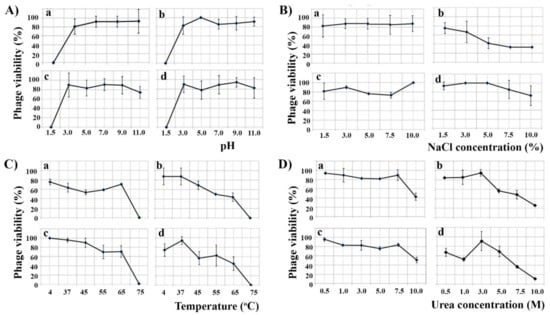 Effect of different pH (A), NaCl concentrations (B), temperatures (C) and urea concentrations (D) on the infectivity of B. bronchiseptica phages CN2 (a), FP1 (b), LK3 (c) and MW2 (d).