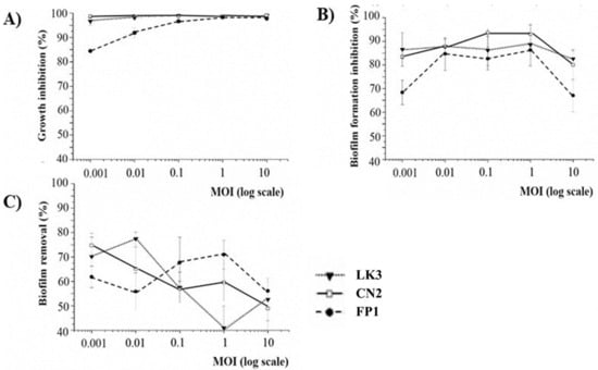The results of bacterial growth, biofilm inhibition and biofilm removal by LK3, CN2 and FP1 phages are shown in Figure 4.