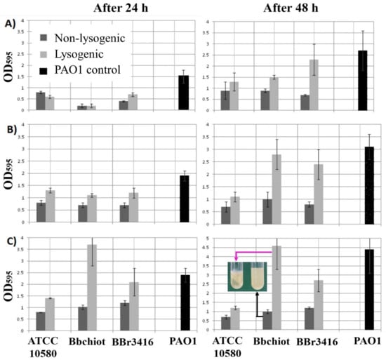 To determine the biofilm formation potential of lysogenic bacteria, the previously described method by Stepanovic et al., 2000 was used []. Briefly, both lysogenic (ATCC10580+, Bbchiot+ and Bbr3416+) and non-lysogenic (ATCC10580, Bbchiot and Bbr3416) bacterial strains were grown in LB medium over 48 h. After incubation, every strain was washed tree times with sterile distilled water and the number of bacteria was adjusted to ~2 × 103, 2 × 105 and 2 × 107 CFU mL−1. In two separated microtiter plates, 200 μL of bacterial suspension was added, and both plates were placed at 37 °C; one plate was incubated for 24 h while the second one was incubated for 48 h. The LB medium without bacteria was used as a negative control and a Pseudomonas aeruginosa PAO1 reference strain was used as a positive control in the experiment. After incubation, all wells, including controls, were washed three times with PBS (pH 7.4) to remove planktonic cells that were not part of the biofilm. Formed biofilm was fixed with 150 μL of methanol for 15 min, after which the methanol was removed and the plates were dried in an incubator at 44 °C for 20 min. Dried plates were stained with 0.4% crystal violet solution for 15 min, after which the stain was removed by washing the plates with water. The plates were then placed back into the incubator at 44 °C for 15–20 min to dry. After incubation, 150 μL of 33% acetic acid was added in each well to dissolve the stain from biofilm. Absorbance was measured on Multiscan GO (Thermo Scientific, Lithuania) plate reader at 595 nm. The experiment was carried out in triplicate and on three independent occasions. The results were presented graphically, as mean value of absorbance with standard deviation.