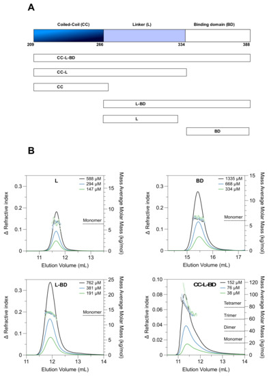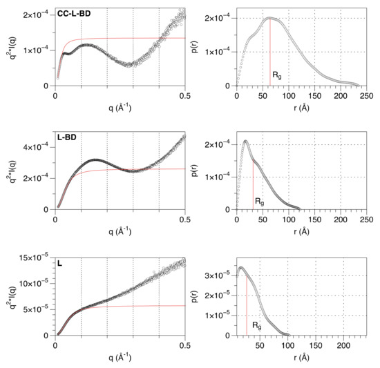 The relative scattering intensity at zero angle I(0) was estimated via standard Guinier analysis [51]. The Guinier plots were linear, and I(0) scaled linearly with protein concentration in all cases (Figure S2) suggesting the absence of any significant inter-particle interference. This also established that the tetrameric CC-L-BD does not measurably dissociate over the studied concentration range (8–240 µM), reinforcing the hydrodynamic analysis performed previously.