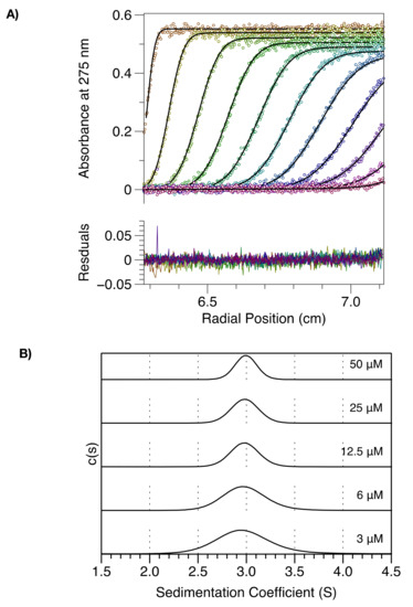 To further investigate self-association of the MenV P protein, sedimentation velocity analytical ultracentrifugation (SV-AUC) experiments were carried out on CC-L-BD. Protein sedimentation was followed by measuring absorbance at 275 nm and the data were analyzed in SEDFIT [41,42] to derive sedimentation coefficient distributions, c(s), and molar mass distributions, c(M), for the protein at varying concentration (3–50 µM).