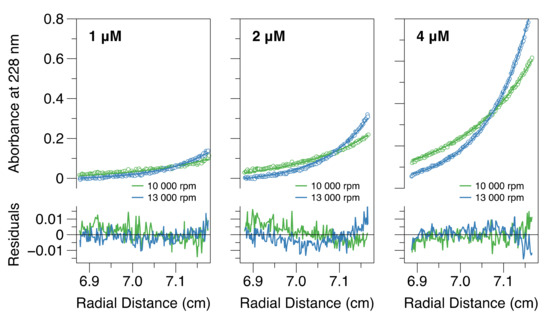- Vistica, J.; Dam, J.; Balbo, A.; Yikilmaz, E.; Mariuzza, R.A.; Rouault, T.A.; Schuck, P. Sedimentation equilibrium analysis of protein interactions with global implicit mass conservation constraints and systematic noise decomposition. Anal. Biochem. 2004, 326, 234–256. [Google Scholar] [CrossRef]
