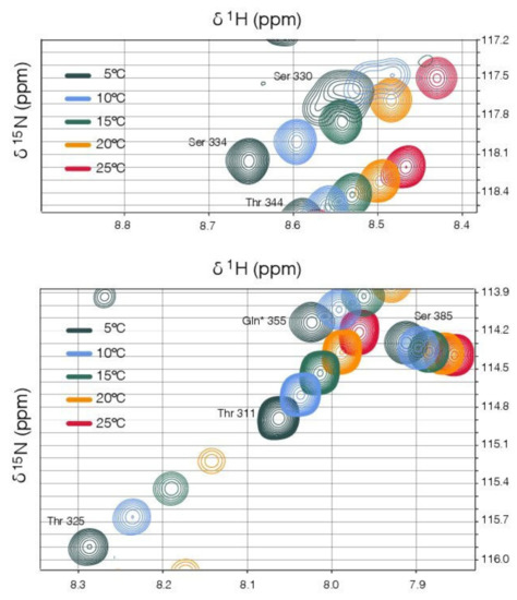 A striking feature of the NMR spectra is the very strong temperature-dependent line broadening that occurs in several regions of the linker. Particularly affected are resonances associated with residues 277–288, a region proximal to the coiled-coil predicted to have alpha-helical propensity (Figure S2), and residues 325–333, the region immediately adjacent to the binding domain. In each case the resonances broaden with increasing temperature (5–25 °C). For the region adjacent to the binding domain, the line broadening is so extensive that some resonances can no longer be detected at the higher temperatures (Figure 6). This suggests that temperature-dependent conformational exchange processes are occurring in both these regions, though it is not possible to infer either the timescale or the exact nature of the underlying conformational changes from the line broadening alone [84,85].