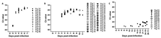 ASFV genomic material in whole blood samples from pigs infected with ASFV Malawi LIL 18/2, ASFV Estonia 2014, or ASFV OURT/88/3. Groups of pigs (n = 12–39) were infected oronasally with 1 × 105 TCID50 ASFV Malawi LIL 18/2 (A), 2 × 105 TCID50 ASFV Estonia 2014 (B), or 1 × 105 TCID50 ASFV OURT/88/3 (C); on the indicated dpi, whole blood samples from the pigs were collected and assessed for ASFV genomic material using real-time PCR. For the ASFV OURT 88/3 group (C), pigs were re-infected with a dose of 1 × 106 TCID50 ASFV OURT 88/3 on 14 dpi. Ct value of ≤ 35.99, positive. Dead pigs were excluded from the analysis.