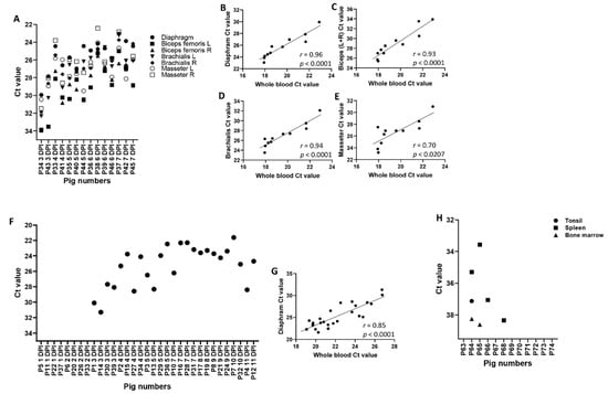 ASFV genomic material in the meat exudate (ASFV Malawi LIL 18/2 and ASFV Estonia 2014) and tissues (ASFV OURT/88/3) from infected pigs. Groups of pigs (n = 14–39) were infected oronasally with 1 × 105 TCID50 ASFV Malawi LIL 18/2 (A) or 2 × 105 TCID50 ASFV Estonia 2014 (F), and on indicated dpi, the respective muscles were collected from the pigs, and the extracted meat exudate was assessed for ASFV genomic material by real-time PCR (A,F). Spearman’s correlation was also performed between the whole blood and various meat exudate types in the ASFV Malawi LIL 18/2 (B–E) and ASFV Estonia 2014 (G)-infected groups of pigs. In another experiment, tissues from ASFV OURT/88/3-infected pigs (n = 12) were also assessed for ASFV genomic material by real-time PCR (H); for this group, pigs were first infected oronasally with 1 × 105 TCID50 ASFV OURT 88/3 and re-infected with 1 × 106 TCID50 ASFV OURT 88/3 on 14 dpi. Ct value of ≤35.99, positive; p < 0.05, significant. Dead pigs were excluded from the analysis.