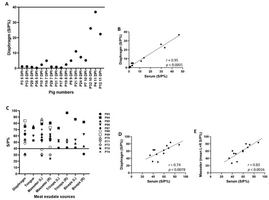 Anti-ASFV antibody levels in the meat exudate from ASFV Estonia 2014 or ASFV OURT/88/3-infected pigs. Groups of pigs (n = 12–39) were infected oronasally with 2 × 105 TCID50 ASFV Estonia 2014 or 1 × 105 TCID50 ASFV OURT/88/3. The ASFV OURT/88/3 group was re-infected with 1 × 106 TCID50 ASFV OURT88/3 on 14 dpi. At the end of the experiment, the meat exudate from muscles of pigs infected with ASFV Estonia 2014 (A) and ASFV OURT88/3 (C) were assessed for antibodies to ASFV using the I.D. Screen ASF ELISA kit. Spearman’s correlation was also performed between the serum and meat exudate: diaphragm for ASFV Estonia 2014 group (B); diaphragm and masseter for ASFV OURT88/3 group (D,E). Cut-off value for ID Screen: <30%, negative; 30–40%, doubtful; ≥40%, positive. p < 0.05, significant. Values plotted are from 5 and 6 dpi for ASFV Estonia 2014 and ASFV OURT/88/3-infected groups of pigs, respectively.