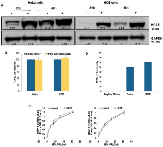 In order to examine the importance of HPSE in the various aspects of HSV-1 infection, human HPSE expression plasmid pIRES2 EGFP-HPSE1 (HPSE) was used to induce the expression of HPSE in HeLa and HCE cells. The empty vector pIRES2 EGFP was used as a control. The overexpression of HPSE was confirmed at the protein level using Western blot analysis in both HeLa and HCE cells 24 and 48 h post transfection (Figure 1A). We confirmed the HPSE transfection by monitoring the expression of GFP, tagged to HPSE (Figure S1 in Supplementary Materials). The signal intensity of HPSE relative to GAPDH represented on the blot suggests the higher amount of HPSE being produced after transfection. The relative fold change in the signal intensity is 3.4 and 3.6 at 24 h post transfection and 2.3 and 9.8 at 48 h post-transfection in HeLa and HCE transfected cells with respect to untransfected cells, respectively. To evaluate the effect of enhancing HPSE expression on cell viability, MTT assay was performed 1 day post HPSE overexpression. Higher HPSE levels in HeLa and HCE cells showed no effect on cell viability (Figure 1B).