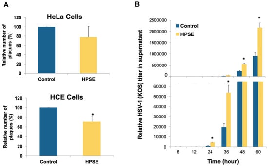 Since overexpressing HPSE did not affect HSV-1 entry into HeLa and HCE cells, the effect of enhanced HPSE expression on virus plaque formation was analyzed [30]. Syncytial plaque formation reflects the ability of the virus to spread from cell to cell. Enhancing HPSE expression in HeLa and HCE cells reduced the plaque numbers by 22.5% (p > 0.05) and 29.6% (p ≤ 0.05) respectively compared to cells transfected with an empty vector (Figure 2A). This suggests that higher HPSE expression may tend to prevent syncytial spread of the virus. To determine whether it affects extracellular release of the virions, virus egress assay was performed in HeLa cells overexpressing HPSE plasmid. HeLa cells were either transfected with an empty vector or with HPSE expression plasmid. Then, 24 h post transfection, cells were infected with HSV-1 (KOS) for 2 h. Then, the cells were washed, growth media was added, and incubation was continued. At the indicated time points, 100 µL from the growth medium were collected and titered to measure virus release from the cells. Enhancing HPSE expression resulted in significantly higher HSV-1 release into the culture supernatant (p ≤ 0.05) (Figure 2B). These results verify our previous findings that HPSE plays an important role in extracellular virus egress, possibly through cleaving HS chains from infected cells.