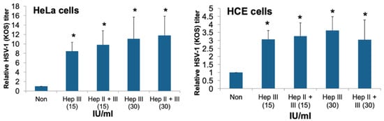 In order to confirm that HS removal from the cell surface is a mechanism for enhancing HSV-1 egress from infected cells, the effect of the addition of exogenous recombinant heparinases on HSV-1 egress was evaluated. HeLa and HCE cells were infected with HSV-1 (KOS) at MOI of 0.1 and 0.01 respectively for 2 h at 37 °C. Then, cells were washed, and bound virus was removed by citrate buffer (pH = 3) treatment, followed by cells washing. Then, cells were treated with either heparinase III (15 and 30 IU/mL), or a combination of both heparinases II and III (15 and 30 IU/mL) for 2 h at 37 °C. After 2 h, cells were washed, growth medium was added back to the cells, and incubation was continued for 20 h at 37 °C. HSV-1 release was measured by titering the supernatant of the cultured cells on Vero cells. As a control, some cells were infected but were not treated with the heparinases. Treating cells with heparinase III, or a combination of heparinase II and III at two different concentrations resulted in a significant induction in viral release from infected HeLa and HCE cells to the culture supernatant by 8–11 and 3–3.6 folds, respectively (p ≤ 0.05) (Figure 3). These results strengthen the notion that HPSE facilitates HSV-1 release.