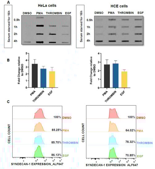 3.4. PMA, Thrombin, and EGF Treatment Accelerates Syndecan-1 Shedding from HeLa and HCE Cells’ Surfaces to the Culture Supernatant