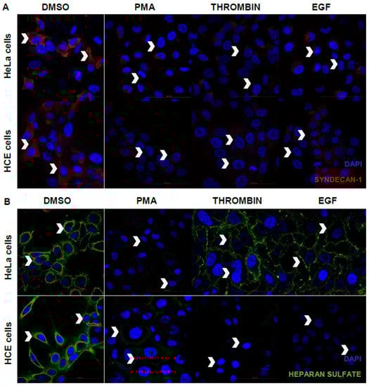 HeLa cells and HCE cells were cultured in glass-bottom dishes (MatTek Corporation, Ashland, MA, USA). At 40% of confluency, the cells were serum starved for 12 h. Then, cells were treated with DMSO, PMA, thrombin, and EGF for 4 h. After 4 h post-treatment, cells were fixed in 10% paraformaldehyde for 15 min. The cells were washed with PBS, which was followed by incubation with PBS with 1% bovine serum albumin (BSA) at 4 °C for 1 h. Then, the cells were washed with PBS buffer and incubated with the primary antibody at a dilution of 1:100 for 1 h at 4 °C. The primary antibody was removed by washing with PBS again, and cells were incubated with FITC-conjugated secondary antibody for heparan sulfate (green) and Alexa fluor 647 (red) for syndecan-1 expression on the cell surface at a dilution of 1:100 for 1 h and were examined under the Zeiss 710 confocal microscope (Jena, Germany) using a ×63 oil immersion objective lens with the pinhole set to 1 AU.