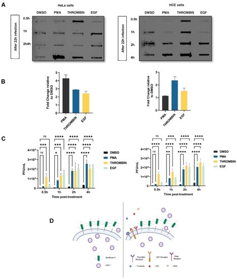 Initial results suggest an increase in active HPSE expression in HSV-1 infected cells and the involvement of HPSE in HSV-1 release from infected cells. Additionally, it has been shown that HPSE enhances the shedding of syndecan-1 from tumor cells [26]. Therefore, enhanced virus release from HSV-1 infected cells by HPSE overexpression and exogenous heparinases might be, at least partially, influenced by the induced syndecan-1 shedding by HPSE. Similarly, the same effect of PMA, thrombin, and EGF on the syndecan-1 shedding was also observed. Now, to understand the accelerated effect of syndecan-1 shedding by PMA, thrombin and EGF treatment on virus release from infected cells, the following set of experiments were performed. Both HeLa and HCE cells were infected at an MOI of 0.01 with HSV-1 (KOS) for 2 h. After 2 h, complete media was added, and incubation was continued for 8 h. Then, cells were serum starved for 12 h, which was followed by PMA treatment (1 µM), thrombin treatment (5 mg/mL), and EGF treatment (10 ng/mL) in serum-free media for 0.5, 1, 2, and 4 h, and the supernatant was collected at each time point. Control cells were DMSO treated. The effect of PMA, thrombin, and EGF on viral egress by syndecan-1 shedding was observed by analyzing the gD of the egressed virus post treatment through a slot blot analysis (Figure 6A). The bands here represent the gD from the egressed virus that was also found to be maximum at 4 h post treatment, which was similar to maximum syndecan-1 shedding at the same time point earlier. The densitometry analysis of the total gD measured in the culture supernatant in 4 h treatment of the cells with PMA, thrombin and EGF showed total enhanced viral egress after treatment relative to the DMSO (control)-treated cells (Figure 6B). To quantify the total infectious particles released post treatment, plaque assay was performed after 0.5, 1, 2, and 4 h time points. HSV-1 released to the culture supernatant was evaluated by titering 100 µL of culture supernatant on Vero cells. PMA, thrombin, and EGF treatment resulted in an enhanced HSV-1 release from infected cells to the culture media, with the most significant increase to be at later time points (2 and 4 h) (Figure 6C). Figure 6D shows the diagrammatic representation of the results depicting that the treatment of cells with PMA, thrombin and EGF accelerates the process of syndecan-1 shedding in the culture supernatant, resulting in enhanced viral egress.