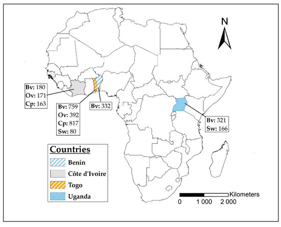 Map of countries where sera were collected. The number of samples collected from each species is indicated. Bv: cattle; Ov: sheep; Cp: goat; Sw: swine. In Uganda, all sera were collected in slaughterhouses. The map was designed using ArcMap 10.4 (ESRI, Redlands, CA, USA).