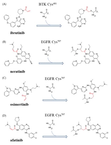 Covalent drugs bind to their target protein by forming a covalent bond with the amino acid. Ibrutinib is a covalent inhibitor of Bruton’s tyrosine kinase (BTK), and the mechanism is used to block the active site by forming a covalent bond between the α, β-unsaturated carbonyl motif, and cysteine-481 of BTK (A). Neratinib (B), osimertinib (C), and afatinib (D) have been developed for the inhibition of EGFR activity. The three compounds selectively bind to the active site (containing cysteine-797) of EGFR via a covalent bond.