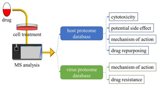 Before clinical trials for a candidate drug, the cytotoxicity and potential side effects in the human body need to be investigated as important as the antiviral effect. Unfortunately, information on the interaction in complex body envelopment is difficult to obtain using a simple-cell platform. The animal model can provide data on the effect on organisms in actual physical conditions, although there are inevitably species differences and the high cost of animals. Using proteomics, the influences in probably biological function and relationship of multiple cell/tissue types during drug treatment can be predicted in cell-based experiment with the high-throughput analysis and bioinformatics [81]. Moreover, because of the comprehensive identification of drug-targeted proteins, the available drugs, such as generic drugs, might be observed to target other virus-associated proteins and are involved in multiple signaling pathways to reduce the infection of different virus types and can be developed for new therapeutic uses and potential broad-spectrum antiviral agents (Figure 7).