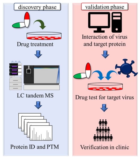 Improving the feasibility of drug repurposing with proteomics. The target proteins of a specific drug were identified during the discovery phase (left). The two groups of suitable and stable cell lines were treated with/without the reported drug, and these cellular proteins were analyzed using shotgun proteomics to identify the IDs and post-translational modifications (PTMs) of target proteins. These drug-targeted proteins might be involved in the viral life cycle in different viral infections. After a search of the literature, the potential viral inhibitory activity of target drugs, which are selected based on the relationship of virus and proteins, was evaluated by drug testing and further clinical trials with a large sample size (right).