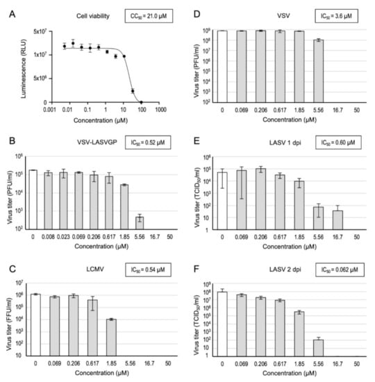 For infection with authentic LASV, Vero E6 cells were pre-treated for 1 h with the respective compounds at the indicated concentrations, infected with the virus at an MOI of 0.01 in the presence of the respective compounds, and cultured in the presence of the respective compounds for a further 24 or 48 h. Virus titers were determined by performing a median tissue culture infectious dose (TCID50) assay, as described in 2.5. All the experiments with infectious LASV were performed in the BSL-4 facility at the Institut für Virologie, Philipps-Universität Marburg, Marburg, Germany.
