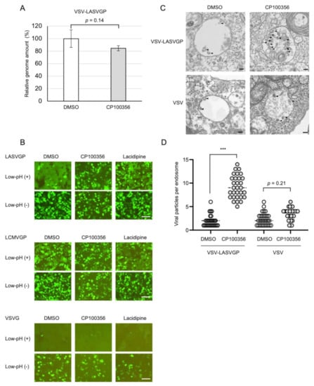 Vero cells and Vero E6 cells were cultured in Eagle’s minimum essential medium (MEM) supplemented with 10% fetal calf serum, 1% non-essential amino acid solution, 1 mM sodium pyruvate, 5 mM L-glutamine, 50 U/mL penicillin, and 50 μg/mL streptomycin at 37 °C with 5% CO2. BHK-21 cells were cultured in MEM supplemented with 1 mM sodium pyruvate at 37 °C with 5% CO2. HEK293Τ cells were cultured as for the BHK-21 cells, but using Dulbecco’s Modified Eagle’s medium (DMEM). The replication-competent VSV pseudotypes expressing LASVGP from either strain Josiah or Alzey were prepared as previously described [], while the wild-type VSV was propagated in Vero cells. LCMV (strain Armstrong 53b) was propagated in BHK-21 cells. Authentic LASV (strain Josiah) was propagated in Vero E6 cells. For pseudotyping, the LASVGP genes from the Josiah strain (GenBank. NC_004296.1) or the Alzey strain (GenBank. LT601602.1), which was isolated from the first case of acquired Lassa fever outside of Africa []; the LCMVGP gene from the Armstrong 53b strain (GenBank. AY847350); the Junín virus GP (JUNVGP) gene from the Romero strain (GenBank. AY619641.1); the Tacaribe virus GP (TCRVGP) gene from the TRVL-11573 strain (GenBank. MT081316.1); the Machupo virus GP (MACVGP) gene from the Chicava strain (GenBank. NC_005078.1); and the Sabia virus GP (SABVGP) gene from the SPH114202 strain (GenBank. NC_006317.1) were cloned into the mammalian expression vector pCAGGS. The vesicular stomatitis virus G glycoprotein (VSVG) gene from the Indiana strain (GenBank. NC_001560.1) was cloned into the mammalian expression vector pCMV. For screening, a total of 2480 small compounds were provided by the Medical Research Support Center, Graduate School of Medicine, Kyoto University. For further experiments, CP100356 (CAS RN. 142715-48-8), lacidipine (CAS RN. 103890-78-4) and Tariquidar (CAS RN. 206873-63-4) were purchased from Sigma-Aldrich (Saint Louis, MO, USA), Tokyo Chemical Industry (Tokyo, Japan), and Cayman Chemical (Ann Arbor, MI, USA), respectively.