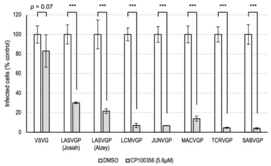 Broad-spectrum inhibitory effects of CP100356 against different mammarenaviruses. Vero cells treated with CP100356 or DMSO were infected with pseudotyped viruses harboring vesicular stomatitis virus glycoprotein (VSVG), LASV glycoprotein (LASVGP) (strain Josiah), LASVGP (strain Alzey), LCMVGP, JUNVGP, MACVGP, TCRVGP, or SABVGP, respectively. Infection was evaluated at 20 h post-infection by counting the number of cells expressing green fluorescent protein relative to the number of nuclei in the wells. Welch’s t-test was used to compare the two groups, and p values are indicated; *** p < 0.001. The values indicate means ± standard deviation of representative experiments in biological triplicates from two independent experiments.