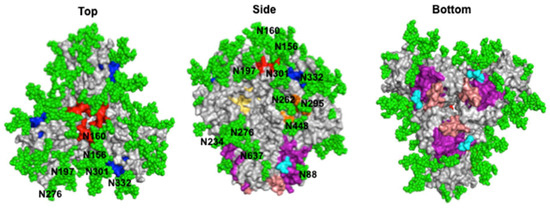 Env also has a “glycan shield” that sterically blocks antibodies from accessing much of its protein surface, with each Env containing 26–30 high-mannose or complex N-linked glycans [17,35] (Figure 2). As viral glycans often resemble “self” within the host, antibodies are less likely to recognize them without peptide sequences, or else they may have some level of autoreactivity [36]. Additionally, mutations in Env can impact glycosylation patterns on its surface, increasing its variability and impacting the neutralization potential of antibodies [37].