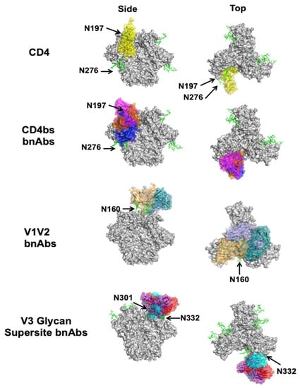 The CD4bs is of particular interest because antibodies against this site can prevent interaction with CD4, the primary receptor for viral entry. The CD4bs lies in a cavity formed at the interface of the gp120 inner and outer domains (Figure 2) [22]. Hydrophobic residues deep in the pocket allow for contacts with Phe-43 of CD4 [51]. As a conserved immune target, the epitope is gated by the V1, V2, and V3 loops, as well as multiple N-linked glycans, notably at positions N197, N262, and N276 [52]. Classically, two overarching classes of CD4bs-directed bnAbs have been identified: the first class are CD4 mimics, which contact the CD4bs with heavy chains encoded by either VH1-2 or VH1-46, while the second class are “CDRH3-dependent bnAbs”, since their interactions with the CD4bs are dominated by the CDRH3 loop [53].