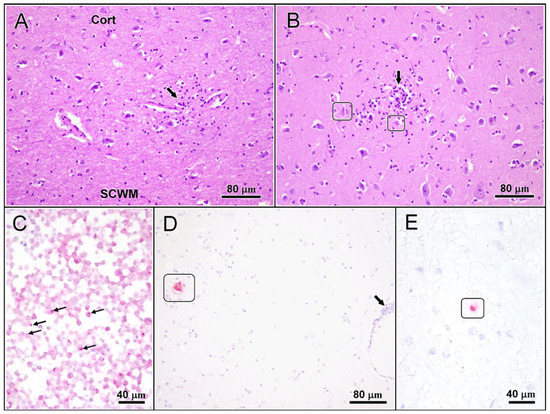 (panels A–E): Brain changes of TBEV-infected 15-year-old haflinger gelding. (A,B): Histological changes comprise multifocal lymphohistiocytic infiltration and microgliosis (arrows) scattered throughout grey matter of cortices (A) and nuclei (B). The infiltrates are occasionally associated with nerve cell degeneration (frames) and neuronophagia (not shown) indicating cytopathic activity of the virus. (C–E): Viral RNA has been visualized using RNA Scope® technology in infected HeLa cells (A: small arrows), used as the positive control, and in affected brains (D,E). At this stage of infection, the yield of viral RNA flags up in individual pyramidal (D: frame) and granule neurons (E: frame) only, even distant from other tissue changes such as lymphocytic perivascular infiltrates (Barrow). Cort: cortex; SCWM: subcortical white matter. Stains/chromagens: (A,B): haematoxilin-eosin; (C–E): haematoxilin (blue)/AEC (red).