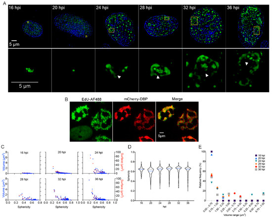 In order to study in more detail the distribution of DBP in the infected cell-nucleus, quantitative analyses were performed using the data obtained directly from the Z-stacks (without rendering) to calculate the volume, surface and sphericity index of the DBP-structures. The volume (blue dots) and surface (red dots) were plotted as a function of the sphericity index (Figure 1C). The distribution of the sphericity as a function of the different time-points is represented by violin plots (Figure 1D). As expected, at 16 hpi, all DBP-assemblies were small structures with a spheroid shape, and at later times post-infection, DBP-positive structures increased in size and deviated from a spherical shape (Figure 1D, 20–36 hpi and 1E).