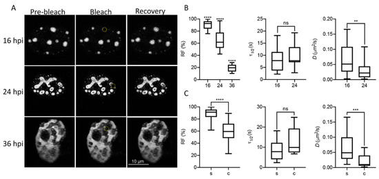 Figure 3A shows pre-bleach, bleach and recovery frames from representative cells at each time-point. At least 16 cells were evaluated for each time-point. The RF, which represents the mobile fraction that contributes to the recovery of fluorescence; the τ1/2, which is the time it takes for the curve to reach 50% fluorescence intensity between the bleached point and the plateau; and the diffusion coefficient, D, were measured to compare these parameters between time-points (Figure 3B), and between the spheroid (s) or complex (c) morphologies observed for DBP (Figure 3C) in infected cells. At 16 hpi, when DBP was mostly organized in spheroid foci (see Figure 1), the RF was almost 100%, and decreased at later times post-infection when more complex ring-like, fiber-like or amorphous structures were observed (Figure 3B,C). At 36 hpi, the average of the RF was almost null (Figure 3B) and therefore the τ1/2 and D could not be calculated. The τ1/2 increased to almost 20 s by 24 hpi for complex DBP-structures. However, although the average diffusion coefficient decreased by 24 hpi for non-spherical structures, the diffusion coefficients at this time-point are consistent with that of phase-separated organelles which range between 1 × 10−5 and 5 × 10−1 µm2/s [79,80]. The decrease in liquid-like properties of DBP-assemblies at later time-points suggests that they may undergo what has been called an ageing process, transitioning from liquid to gel or solid states, as has been reported for other liquid condensates [81,82].