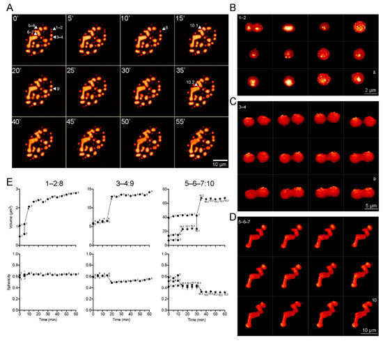 3D-reconstruction images were generated to qualitatively analyze the changes in morphology during fusion events. Figure 4A shows a montage of frames extracted from Supplementary Movies S10 and S11, where DBP condensates with different sizes and shapes that fuse together are indicated by arrowheads and numbers. Figure 4B–D show a montage of the 3D reconstruction of condensates indicated in Figure 4A. The volume and sphericity index of DBP condensates were measured directly from the Z-stacks (without rendering) and are presented as a function of time in the plots in Figure 4E. The spheroid condensates 1 and 2 (with volumes of approximately 1.1 µm3 and 0.5 µm3, respectively) fused within the first 10 min of imaging forming condensate 8 resulting in a similarly spheroid shape and a volume of around 2.5 µm3 (Figure 4B,E, left column: 1–2:8). Condensates 3 and 4 are similar in size, but larger than 1 and 2, and fuse within 20 min of imaging forming condensate 9 with a less spherical volume approximately 15 µm3 (Figure 4C,E, middle column: 3–4:9). Condensates 5 and 6 make contact and begin fusion during the first 15 min of imaging forming condensate 10.1, which then fuses with condensate 7 at 35 min resulting in an enlarged condensate of more than 60 µm3 (Figure 4D,E, right column: 5–6–7:10). Taken together, the data obtained by FRAP and time-lapse live-cell microscopy analyses from HAdV-infected cells show that DBP assembles liquid-like RCs that fuse and mature into larger and less fluid-like condensates.