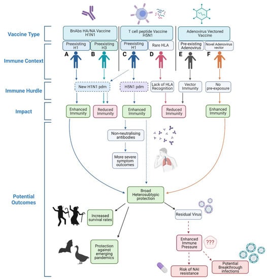 Overview of potential hurdles to varying universal IAV vaccination strategies. Individual (A) vaccinated with a H1N1 BnAbs HA/NA vaccine with prior H1 exposure would have enhanced immunity when exposed to a novel H1N1 pdm virus. Conversely, individual (B) also vaccinated with a H1N1 BnAbs HA/NA vaccine but with prior H3 exposure may have reduced immunity against the same novel H1N1 pdm virus. After vaccination with a H5N1 T cell peptide vaccine individual with prior H1 immunity (C) would have enhanced protection against a homosubtypic H5N1 challenge but may have reduced protection against a novel H1N1 pdm virus. Individual (D) who possesses a rarer HLA type may fail to be protected by a T cell peptide vaccine due to lack of T cell recognition. After vaccination with an adenovirus vectored vaccine an individual with prior vector immunity (E) would have impartial priming leading to reduced immunity, whereas an individual with no prior adenovirus vector exposure (F) would be sufficiently primed. Created in biorender.com.