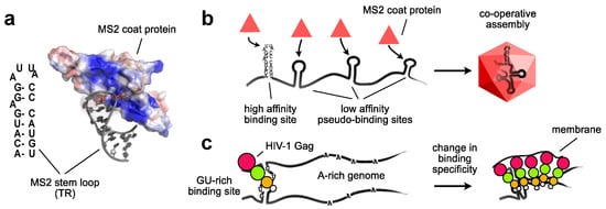 RNA viruses distinguish their genomes from cellular RNAs using cis acting packaging signals that serve as high affinity binding sites for the viral capsid (or nucleocapsid) proteins []. RNA readily folds back on itself to form secondary and tertiary structures, which are complex enough to enable the specific recognition of RNA by proteins []. A canonical example is the 19 nucleotide stem-loop, also known as TR, in the genome of the MS2 bacteriophage (Figure 1a) [,,]. The MS2 coat protein (CP) dimer specifically recognizes this short stem loop structure to initiate assembly. Despite the simplicity of the structure, which is only formed from local base-pairings, MS2 CP binds with high affinity and specificity. This has led to the extensive repurposing of the TR-CP interaction in applications such as single molecule live cell imaging [,]. Remarkably, stem-loops having a C at position −5 in the loop have a higher affinity for CP than the wild-type U []. Whilst this is useful for biotechnology purposes, it also neatly demonstrates that increased affinity is not always beneficial for viruses, presumably because genomes must eventually be released during the early steps of the next replication cycle. Interestingly, high-throughput RNA structure-function analyses reveal that nucleotides in the stem can be exchanged without impairing binding to CP. In contrast, specific single stranded residues were required for function [,]. This is because, for the most part, RNA binding proteins (RBPs) make non-specific interactions with double stranded RNA (dsRNA) through generic contacts with the 2′hydroxyl groups of the ribose or the phosphodiester backbone []. For RNA viruses, non-specific affinity is usually driven by electrostatic interactions between positively charged patches on capsid protein subunits and the negatively charged nucleic acid genome. On the other hand, unique structural features created by loops and mismatches can be more readily recognized through extensive sequence-specific contacts [].