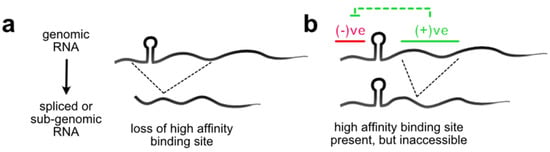 Selection of genomic RNA from non-genomic viral RNA. Dotted lines signify splicing or production of sub-genomic RNA. (a) Non-genomic RNA cannot be packaged because it does not contain the high affinity binding site for the (nucleo)capsid protein; (b) Non-genomic RNA contains the sequences for high affinity binding site, but it is not presented for binding. In HIV-1, negative regulatory elements (−ve) upstream of the splice donor (SD) conceal the Gag binding site unless counteracted by positive regulatory (+ve) sequences downstream of the SD.