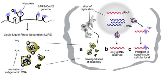 Coronaviruses (CoV) have extraordinarily large genomes (~30 kb) that presumably pose additional difficulties for packaging, yet genomic RNA is efficiently and selectively incorporated into virions [,,,]. Accumulating evidence suggests that SARS-CoV-2 exploits liquid-liquid phase separation (LLPS) during its replication [,,,,,,,,] (Figure 3). LLPS occurs when biological molecules condense into a phase resembling a liquid droplet, and is an emerging paradigm for organizing membrane-less viral factories [,]. It is a common property of RBPs containing intrinsically disordered regions (IDR), such as the SARS-CoV-2 nucleocapsid (N) [,,,]. LLPS of N protein is enhanced in the presence of viral RNA [,], and even though N protein binds throughout the genomic RNA [,], LLPS is specifically promoted by RNA sequences at the 5′ and 3′ of the SARS-CoV-2 genome (Figure 3) []. Interestingly, other sequences, such as the CoV frameshift site, were found to disperse condensates [], and importantly, sub-genomic RNA was efficiently excluded from preformed droplets []. This demonstrates that for LLPS mediated packaging, the biophysical properties of RNA-protein interaction are as important as the protein-RNA affinities. LLPS likely promotes viral assembly by enhancing interaction between RNA and N protein within a privileged site [], but may have other roles in viral replication, such as hiding viral RNA from cellular immune sensors [,].