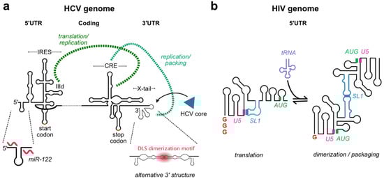RNA structural switches and long-distance interactions regulate the balance between genome replication, packaging, and translation. (a) The HCV life cycle is regulated by a complex network of long-distance intra-molecular interactions and inter-molecular interactions. The packaging site which binds to the HCV core protein resides in the 3′ untranslated region (3′UTR). A long-distance base pairing between the cis-acting element (CRE) in the coding region and the X-tail in the 3′UTR regulates the balance between replication and packaging (light green dotted line). A long-distance interaction between the CRE and the internal ribosome entry site (IRES) regulates the balance between replication and translation (dark green dotted line). The 3′UTR is alternatively structured, leading to the formation of homodimers through an intermolecular interaction. The HCV 5′UTR binds the host microRNA miR-122 to regulate different aspects of HCV replication; (b) A structural switch in the HIV-1 5′UTR regulates the balance between genome translation and packaging. Transcripts beginning with three G residues fold into a monomer conformation and are preferentially translated. Transcripts beginning with one G residue fold into a dimer conformation. Structural switching is mediated by mutually exclusion interactions between regions U5 (pink), SL1 (blue), the AUG region (green), and a host tRNA (purple).