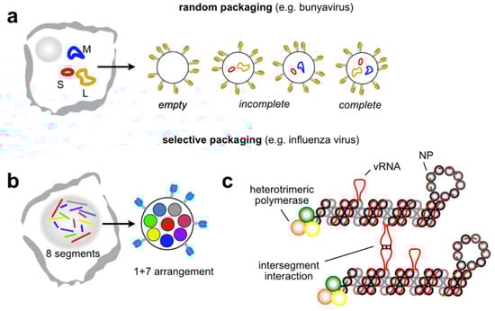 Segmented viruses package their genomes randomly or by using segment specific packaging signals. (a) Bunyavirus randomly package three genome segments, small (S), medium (M) and large (L), such that many progeny virions are empty or incomplete; (b) Influenza A virus package 8 genome segments selectively. Genome segments within budding virions are organized into a 1 + 7 arrangement with one central segment surrounded by seven others; (c) Influenza vRNAs are packaged as viral ribonucleoproteins (vRNPs). vRNAs are bound by nucleoprotein (NP) and a heterotrimeric polymerase. vRNA is incompletely coated by NP allowing for inter-segment vRNA-vRNA interactions to occur as a possible mechanism underlying the selective packaging process.