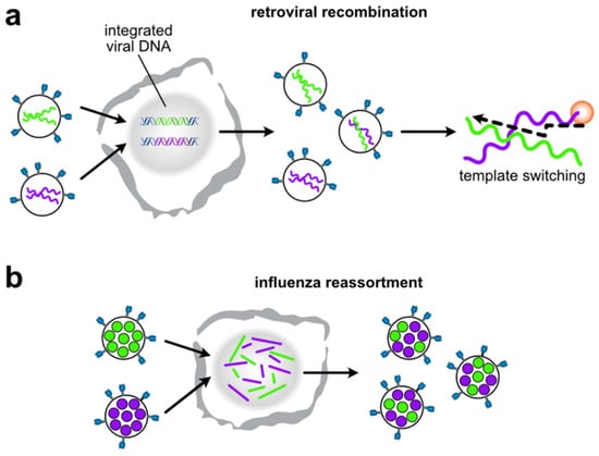 RNA based packaging signals play a much broader role in viral life cycles than assembly, and it is now appreciated that RNA virus genome structures enhance virus ‘evolvability’ by facilitating gene exchange during co-infection []. One widespread strategy is template switching during replication leading to recombination and the formation of genome chimeras, which is a conserved phenomenon in retroviruses [,] (Figure 6a). Another common strategy is genome segmentation leading to reassortment, which can be seen in rotaviruses and influenza viruses [] (Figure 6b). Recombination and reassortment are both non-random processes that are heavily biased by RNA sequence and structure.