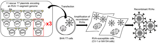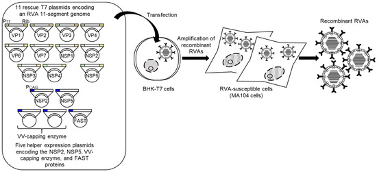 After this initial report of the development of a HuRVA reverse genetics system, the engineering of two other HuRVA strains was described [30,65]. Sánchez-Tacuba et al. (2020) [30] reported the artificial generation of a vaccine candidate HuRVA strain, CDC-9, possessing the G1P[8] genotype [66] using the Sánchez-Tacuba’s reverse genetics approach described above (see Section 3) (Figure 2), in which two rescue T7 plasmids encoding the NSP2 and NSP5 genes were included at 3-fold greater levels than the other nine rescue T7 plasmids. Generation of a recombinant CDC-9 virus with a limited growth history in cell culture (only 11 passages) reconfirmed the robustness of their optimized reverse genetics approach for recombinant HuRVA generation. In addition, a similar approach based on the overexpression of the NSP2 and NSP5 proteins has been reported [65]. The authors described that transfection of BHK-T7 cells with 11 rescue T7 plasmids for the genome of high-yield HuRVA strain Odelia with the G4P[8] genotype [67] along with two helper expression plasmids coding for the NSP2 and NSP5 proteins as well as three helper expression plasmids for the VV-capping enzyme and small membrane fusion protein brought about recombinant Odelia virus, despite the co-transfection of 16 plasmids (Figure 3). Thus, genetic engineering of HuRVA genomes has become as easy as with simian RVAs, and all the HuRVA reverse genetics systems involve the overexpression of NSP2 and NSP5 proteins. Although applications of these HuRVA reverse genetics systems have just been initiated, reverse genetics approach will be a powerful tool useful for obtaining a proper understanding of the molecular biology of HuRVAs in multiple aspects, the development of rationally designed safe and effective next-generation HuRVA vaccines, and for employing HuRVAs as expression viral vectors of intestine-specificity.