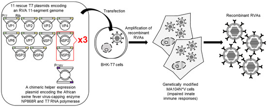 Very recently, a further optimized 11 plasmid-only system-based reverse genetics system with increased virus generation efficiency was developed (Sánchez-Tacuba’s reverse genetics system) [30] (Figure 2). Sánchez-Tacuba’s reverse genetics system employs a chimeric helper expression plasmid encoding the African swine fever virus NP868R capping enzyme and T7 RNA polymerase under the control of the cytomegalovirus promoter [31], combined with a set of 11 rescue T7 plasmids encoding an RVA genome. In addition, genetically modified MA104 N*V cells are used for propagation of a small number of de novo synthesized recombinant RVAs, in which two components of the innate immunity system (interferon regulatory factor 3 (IRF3), and signal transducer and activator of transcription 1 (STAT1)) are degraded. Variations described pertain to the (over)expression of support proteins to enhance the recovery of recombinant RVAs. Sánchez-Tacuba’s reverse genetics system has enabled the recovery of simian strain RRV [32] and a murine-like RVA strain in addition to strain SA11-L2. The original 11 plasmid-only system and its variations have been exploited for the generation of reassortants [33,34,35,36,37], mutated viruses containing defined mutation(s) in the replicating genomes [38,39], and viruses expressing single or multiple reporters [29,30,40,41,42,43,44], proving the robustness of the original 11 plasmid-only system and 11 plasmid-only system-based procedures.