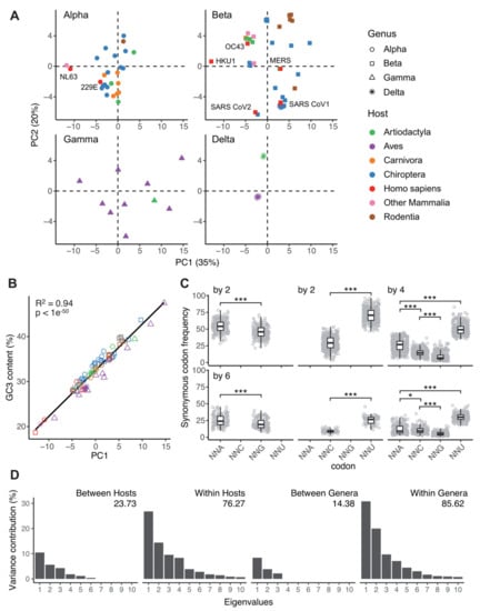 Variation in synonymous codon usage in Coronavirinae. (A) Principal component analysis of synonymous codon usage among CoVs. Each dot corresponds to an individual CoV, for which the frequencies of the 59 synonymous codons have been calculated. CoVs are stratified after the corresponding genera (Alpha-Delta), and host (color code in the inset). The percentage of the variance explained by the first and second axes is given in parenthesis. (B) Correlation between the projection on the first of principal components shown in (A) and the average GC-content at third codon position (GC3) for the corresponding viral genome. Symbols and color code are the same as in (A). The results for a Pearson’s correlation test are shown in the inset. (C) Synonymous codon usage frequency stratified by amino acids of multiplicity 2, 4, or 6 synonymous codons. Differences in median codon usage frequency values were assessed by a paired Wilcoxon signed rank test (code for p-value: * <0.05; ** <0.01; *** <0.001). (D) Results of an internal correspondence analysis for the contribution of the levels “viral taxonomy” (four levels, corresponding to viral genera) and “host taxonomy” (fourteen levels, corresponding to host orders) to explain variability among the eigenvalues of viral genomes on the first 10 principal components in the PCA shown in (A). The values for expected explanatory power for a homogeneous distribution were and 3.72% (p-value < 9 × 10−4) for viral taxonomy and 7.59% (p-value < 9 × 10−4) for host taxonomy.