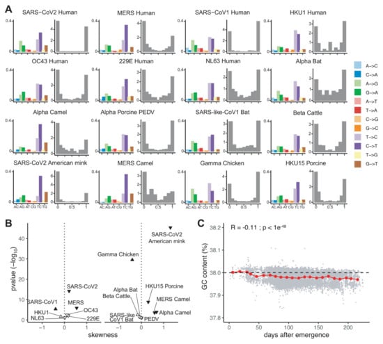 Mutational bias and equilibrium among endemic and recently zoonotic coronaviruses. (A) (left side of each panel) Relative substitution rates for all twelve transition and transversion events, calculated from the total number of SNPs called on the synonymous compartment of a metapopulation composed by all available sequences of the corresponding virus, curated, filtered and aligned. In the x axis, for each of the nucleotide pairs indicated, the frequency of the two substitutions are indicated, e.g.,: A->G in light green and G->A in dark green for the AG pair, or T->C in light purple and C->T in dark purple for the TC pair. (right side of each panel) Folded Site Frequency Spectrum (SFS) of G/C-to-A/T substitutions. For each viral metapopulation, the frequencies of SNPs involving a change in GC content called are plotted, the x-axis progressing from GC-enriching to AT-enriching substitutions. (B) Volcano plot of the folded SFS skewness values presented in (A), plotted against the probability that such a value could have been obtained if the corresponding metapopulation were at its mutational equilibrium. The left panel displays CoVs infecting humans while the right panel displays CoVs infecting other mammalian hosts. Downward and upward triangles, respectively, refer to SFS-negative and SFS-positive skewness values. Filled triangles indicate metapopulations with a skewness significantly different from the expected one at mutational equilibrium. (C) Temporal evolution of the SARS-CoV-2 GC-content in the coding genome during the spread of the pandemic. The GC-content of each individual SARS-CoV-2 genome is represented by a gray dot. Red dots represent the average GC-content by time window of 10 days. The results of a Pearson correlation test of GC content over time for the complete data set (n = 81,963) are displayed in the inset.