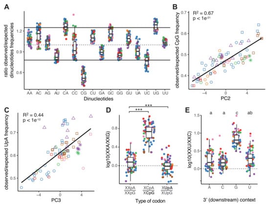 Our initial characterization demonstrated that variation in GC3 content is the prevailing force shaping CUB among CoVs, explaining one-third of the total variation in CUB. We thus tried to identify other evolutionary forces further shaping CUB in CoVs. Previous works have identified that in several RNA viruses infecting humans certain dinucleotides are under-represented, notably CpG and UpA, and that this low dinucleotide frequency has a strong impact on codon-pair bias []. We investigated thus the ratio of the observed over the expected dinucleotide frequency in the CoVs coding sequences. Figure 3A shows that the observed abundance of the CpG dinucleotide in all CoVs lineages is significantly lower than the null expectation based on the individual nucleotide frequency, while this is not the case for the UpA dinucleotide. To a lesser extent, we identify CpA and UpG to be marginally more frequent than expected, which can be linked to the strong decrease in CpG, as they correspond, respectively, to the transitions CpG->CpA and CpG->UpG. We further state that the observed/expected ratios for CpG and UpA correlated well with the second and third dimension of our PCA analysis, respectively (R2 adjusted = 0.67 and 0.44; Figure 3B,C). It is important to remember that these dinucleotide frequency values have been estimated for the complete viral coding sequence and are not limited to the codons themselves, i.e., we also considered the presence of CpG and UpA dinucleotides in the codon boundary context, so that this impact is not simply related to higher frequency of CG-rich or AT-rich codons. This specific point will be addressed below. Overall, our results show that variation in CUB between CoVs is associated with variation in CpG and UpA dinucleotide content.