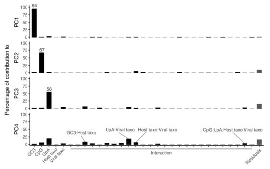 Linear model quantifying the relative contribution of the different variables to the projections of the first four main dimensions of the synonymous codon usage PCA (Figure 1A). Variables included in the linear model are: GC3-content, observed/expected frequency of the CpG dinucleotide, observed/expected frequency of the UpA dinucleotide, host taxonomy at the level of family, viral taxonomy at the level of genus, and all their pairwise interactions. Statistically significant contributions are shown as black bars, stating the percentage of the total explanatory contribution to the correspondent PCA dimension.