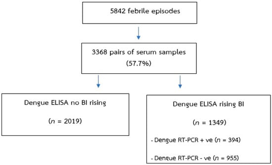 Schematic diagram of the study design and procedures. Specimens collected from children with acute febrile illness. All paired serum samples were used to perform dengue immunoglobulin (Ig)M/IgG enzyme-linked immunosorbent assay (ELISA) tests. The ELISA optical density results were transformed to binding index units.